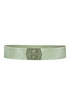 The powder green stretch belt has an almost dusty silvery look. It it closed in the front with to suede covered press buttons.