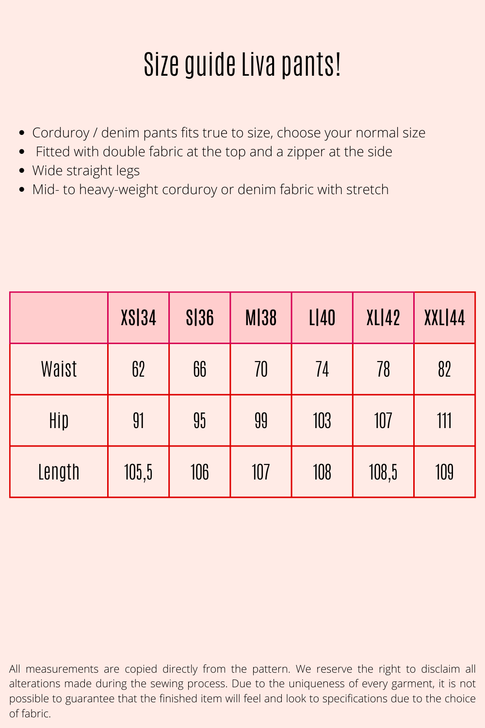 Pasform: Høj figursyet talje med lige ben. Størrelsessvarende.