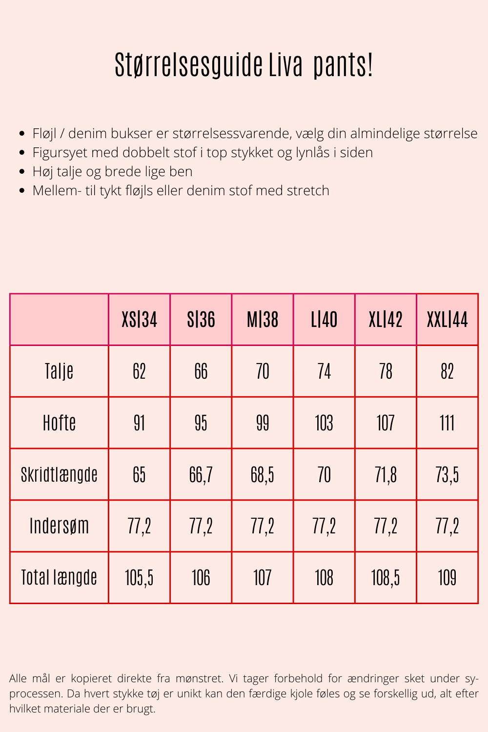 Pasform: Høj figursyet talje med lige ben. Størrelsessvarende.